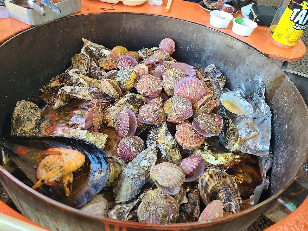 솥뚜껑은 직원이 열어드립니다. 안내문이 붙어있다. 김이 나기 시작하면 익었는지 궁금한 손님들이 솥뚜껑을 여는 모양이다. 안내문이 아니었다면 작가도 열어보았을 거다. 김이 무성하게 오르고 나서 장화 신은 직원이 솥뚜껑을 열어주며 이제부터 먹어도 된단다. 왼손에 목장갑을 끼고 하나씩 꺼내어 먹으니 굴맛이 꿀맛이다. 가리비는 아직 제철이 아닌지 알이 자그맣다.