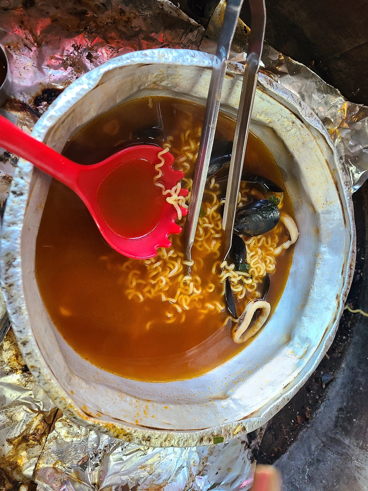 화가를 위해 라면 3인분을 주문했다. 해물을 넣어 끓인 라면이 일품이다. 꼬들꼬들한 면이 학창 시절에 먹었던 라면 맛을 떠올리게 했는데 특히나 찌그러진 커다란 냄비가 예술이다. 웃으며 사진으로 담았다. 친구는 배가 부르다고 하여 화가와 함께 오랜만에 라면 맛을 마음껏 즐겼다.