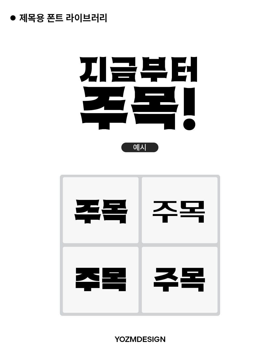 ✔︎ 주목성 있는 제목체: 강렬하고 임팩트 있는 제목용 폰트들을 모았습니다. 시선을 사로잡고 메시지 전달력을 높입니다. 포스터, 배너, 카드 뉴스 제목에 쓰시면 좋겠습니다.