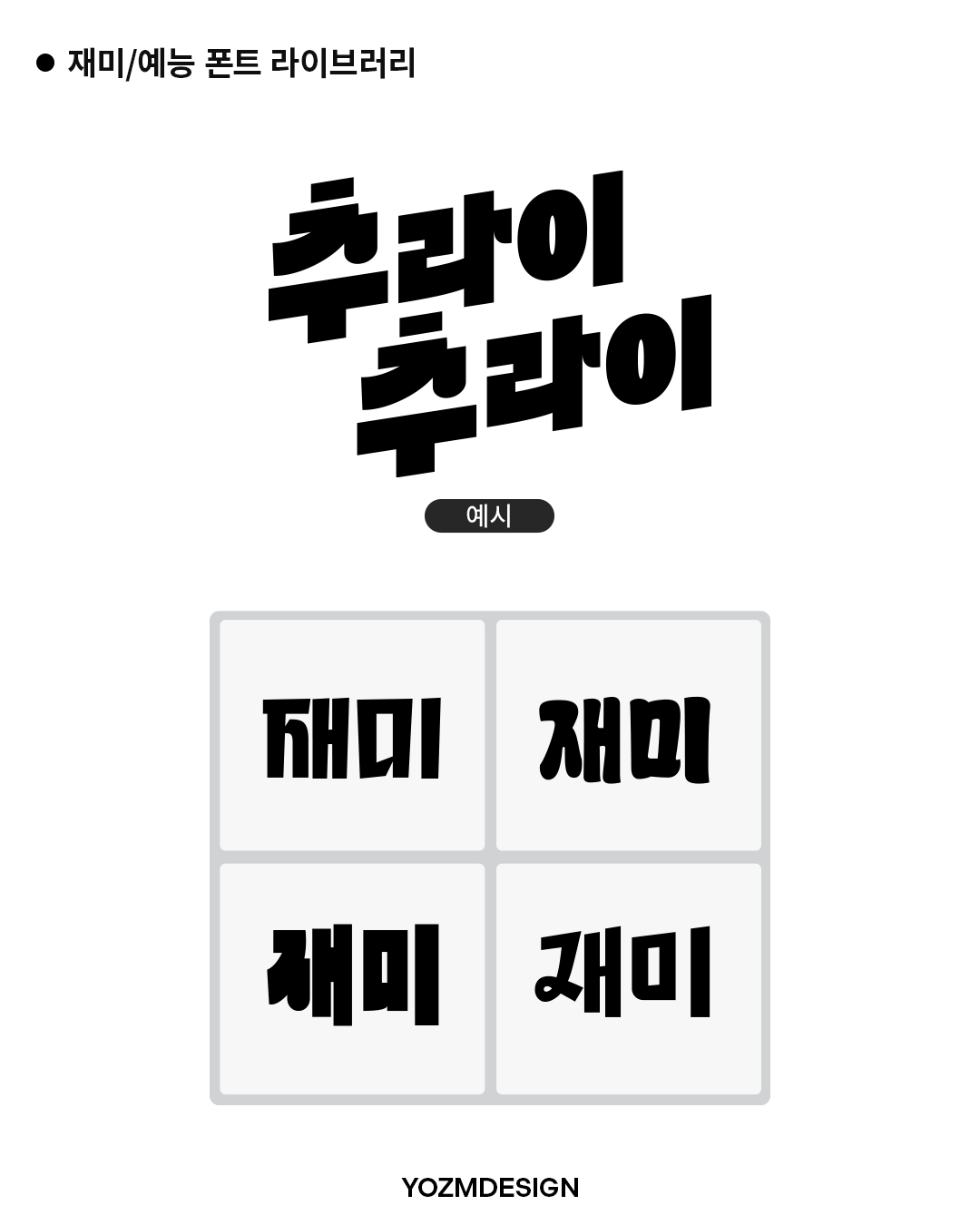✔︎ 재미있는 예능 스타일 폰트: 개성이 느껴지고 유머를 담은 폰트들을 통해 콘텐츠에 활력을 줄 수 있는 서체들입니다. 예능 프로그램 자막, 로고, 유튜브 썸네일, 이벤트 홍보물에 적합합니다.