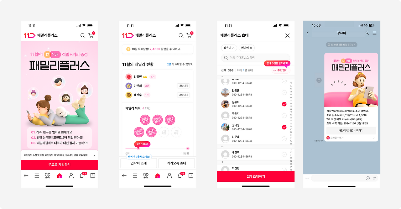 특히 연락처 초대에서는 11번가를 사용 중인 멤버를 추천받을 수 있어요.