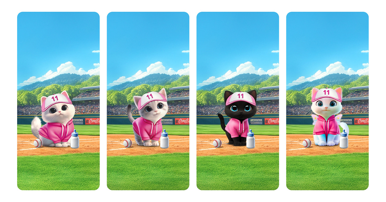 이에 맞춰, 4마리 고양이 모두에게 적용되는 공통 ‘야구장 배경’과 각 캐릭터별로 11키티즈의 시그니처 컬러인 분홍색을 포인트로 한 야구 점퍼와 모자 아이템을 제작했습니다.