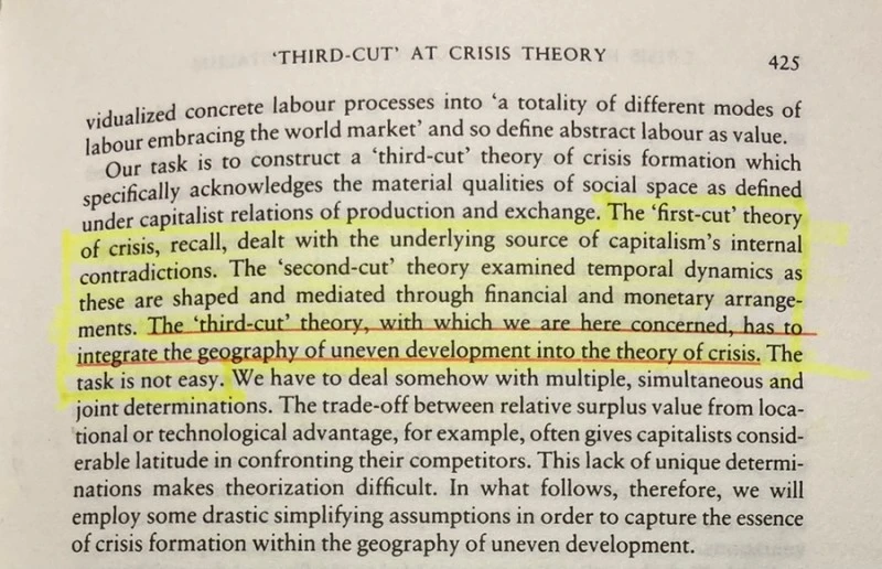 마르크스 연구를 공황의 제3차 계기에 대한 분석으로 확장하면서 하비는 자본주의적 생산양식의 역사지리에 대한 이론적 분석틀을 정립한다.