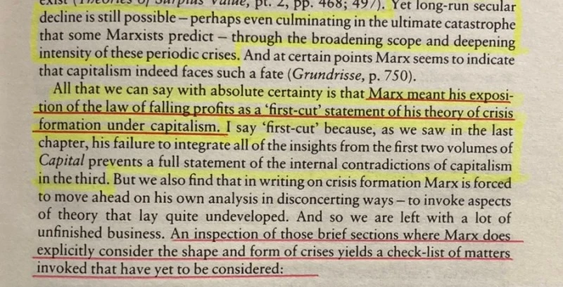 마르크스가 자본론 1권과 2권에서 모든 통찰력을 통합하는 데 실패함으로써 3권에서 자본주의의 내적 모순들에 대한 완전한 진술을 하지 못하는 결과를 낳았기 때문에 하비는 마르크스의 이윤율 저하법칙을 자본주의 공황 형성에서 제1차 국면이라고 간주하는 것이다.