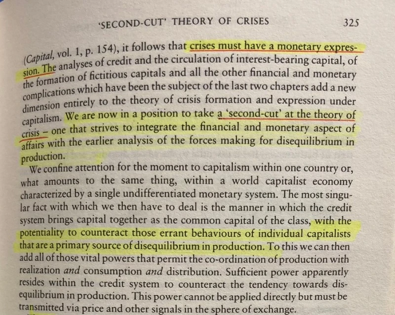 공황의 제2차 계기(second-cut)는 금융 공황과 인플레이션을 포함하는 금융적·화폐적 기원에서 찾는다. 생산 과정의 과잉 축적 문제는 미래사용지향적인 새로운 순환 형태의 창출로 흡수할 수 있으며, 신용 체계가 구원자로 출현하지만 가치 척도로서 화폐적 기반과 대립 관계를 형성하면서 위기가 발생한다고 본다.
