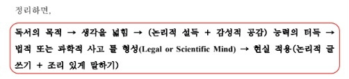 구체적으로 설명하면 독서를 통해서 생각을 넓히고 논리적 설득과 감성적 공감 능력을 터득함으로써 법적 또는 과학적 사고의 틀이 만들어져 급기야는 논리적 글쓰기와 조리 있게 말할 수 있는 논리적 의사표시를 할 수 있다고 본다.