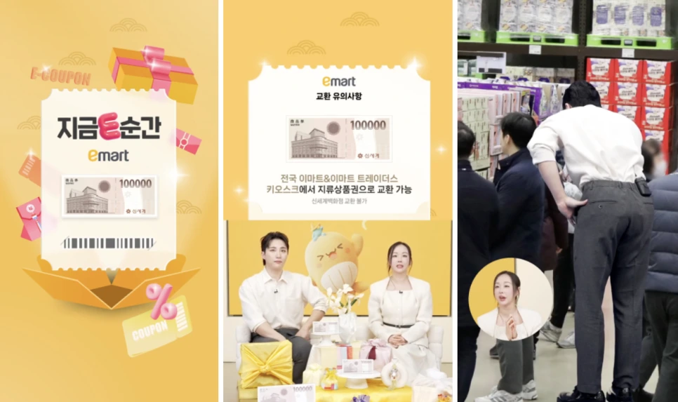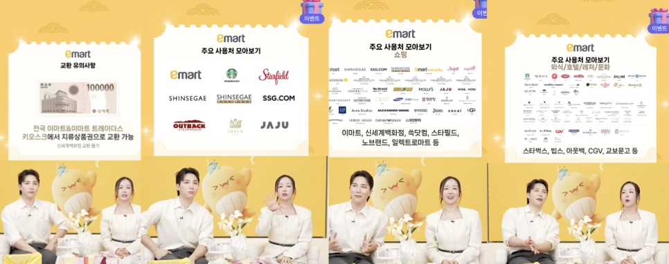 범용성 홍보: 나도 이번에 보면서 알게 됐는데 신세계 상품권 사용처가 엄청 많더라고. 그래서 앞으로 이게 단순한 마트용이 아니라, 정말 다양한 곳에서 쓸 수 있는 '통합권' 같은 성격임을 알리기 위함인 거 같음.
