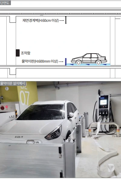 기초에 지하주차장 전기차설치구역부터 아예 물막이판 설치가 가능한 구획을 만들 자입니다. 사실상 수조가 설치된 곳에 깔아버리자 라는 방향성이라 생각하시면 쉽겠네요 물론 아이디어 자체는 좋습니다. 다만 이런 구조장치들이 전부다 고장 나 있으면 또 끌고 나와서 불을 꺼야 한다고?