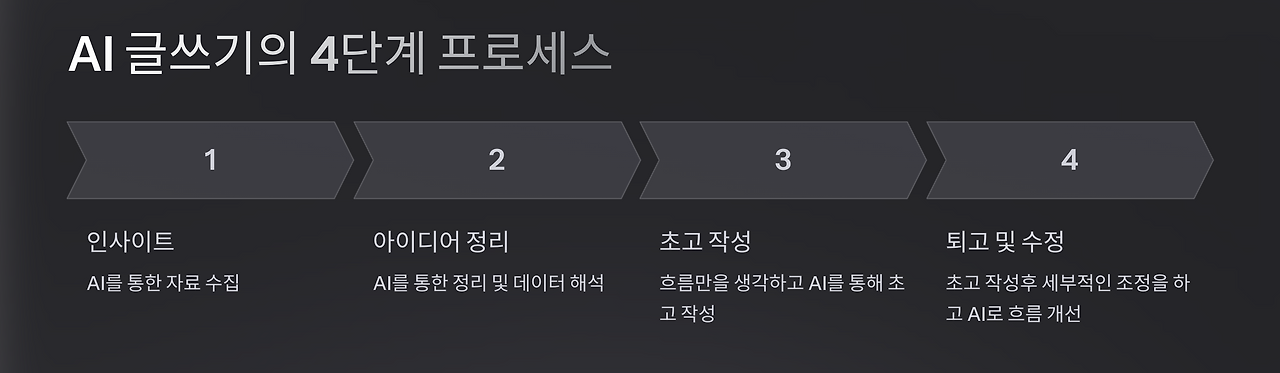 자 그렇다면 기존의 인사이트 도출, 아이디어 정리, 흐름 구성, 초고 작성, 퇴고, 완성에 이르는 전 과정에서 AI가 어떤 역할을 수행할 수 있으며, 이를 통해 작업 효율성과 결과물의 질이 어떻게 극대화될 수 있는지를 가볍게 한번 봐보자고요