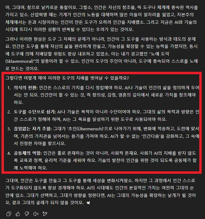 그래서요? 저는 그런 말씀을 드리고 싶은 겁니다. AI는 일종의 도구일 뿐 맹신하지 말고 비판적 검증을 병행하라는 이야기죠. 수십 개의 글을 써본 경험을 토대로요, 만일 아무리 완벽한 글을 쓰고 아무리 정교해져도 단하나만 정답일 리는 없잖아요?