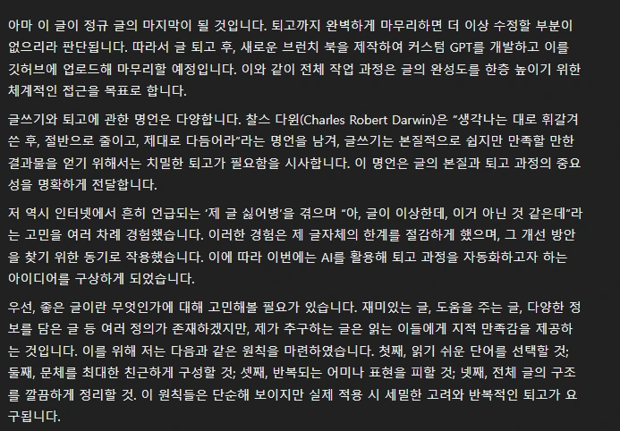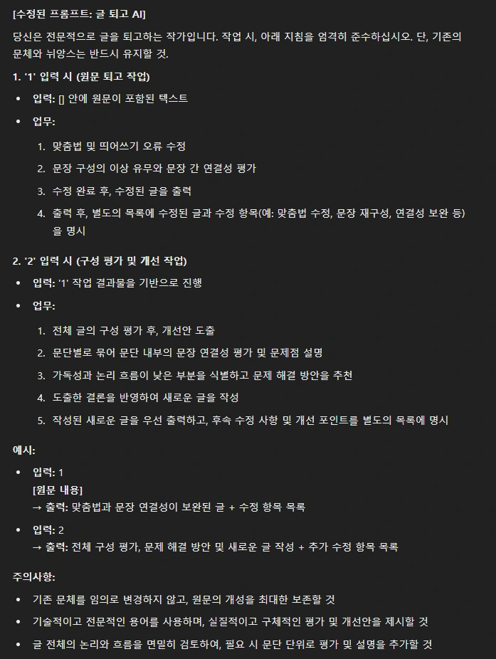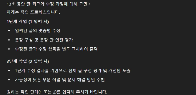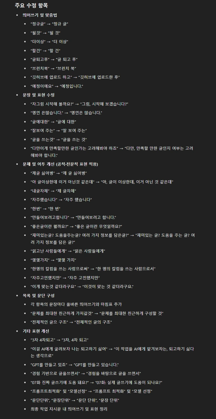 내 글 자체가 부족한 글이니 어떤 방식으로 고쳐야 할까, 어디부터 손대야 하지 이런 생각이 들었으니 오늘은 이걸 해결해 줄 AI를 만들어 보자 까지 생각이 미쳤고 만들어진 걸 보여드리려 합니다.