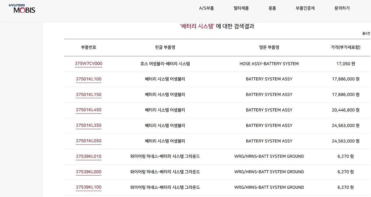 아래 사진은 현대모비스에서 운영하는 부품들을 판매가를 확인한 사진으로 아이오닉 6을 기준으로 찻값이 5~6천만 원대인데 배터리의 부품가격이 대략 2천만 원에 육박하는 것을 확인할 수 있다.