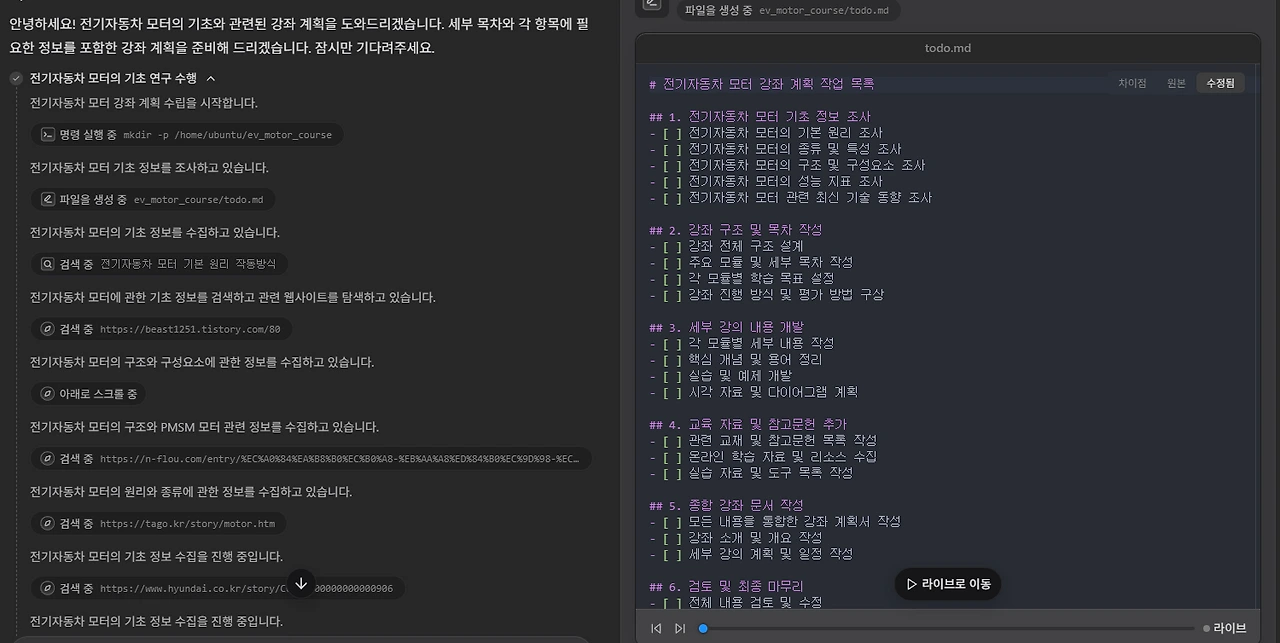 생각보다 작동의 논리구조가 흥미로운데요 실제로 이전 GPT나 클로드에서 수행한 수준으로 작업계획을 세우고 바로 수행합니다,