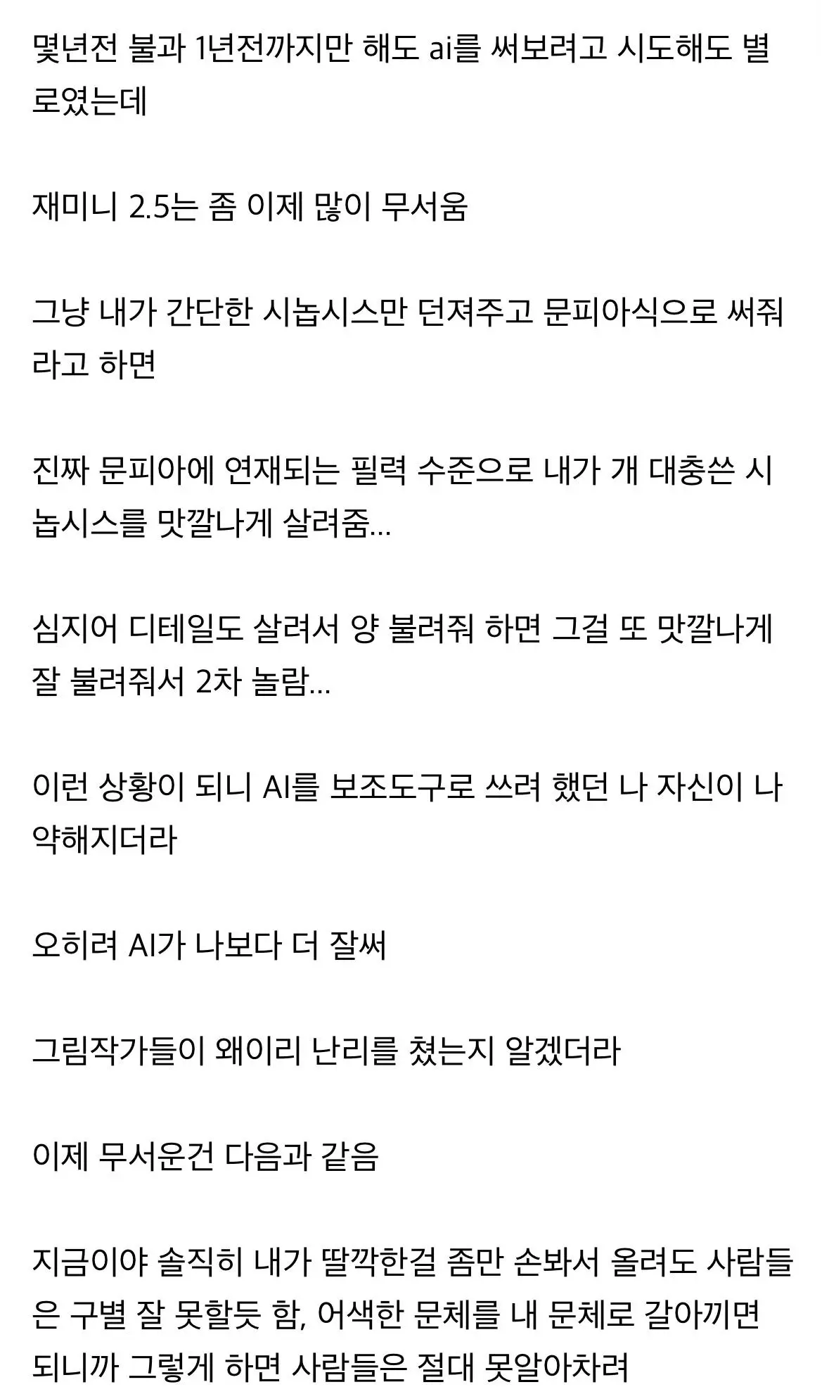 문체가 불편하신 분들도 있겠지만 명백히 제미나이 2.5 이후 인간은 따라 잡히기 시작했습니다.