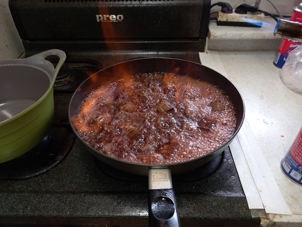 고기에 마이야르 반응 일으키고 와인에 담가 플람베를하면서 자기야 이게 플람베레라고 말은 했었지만