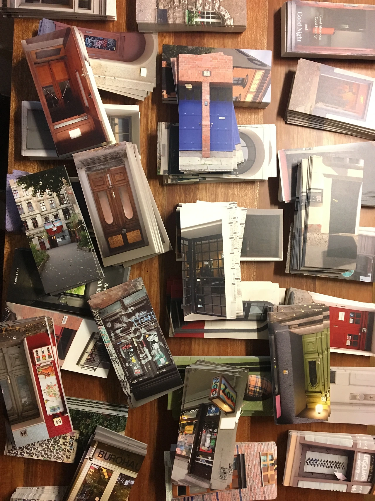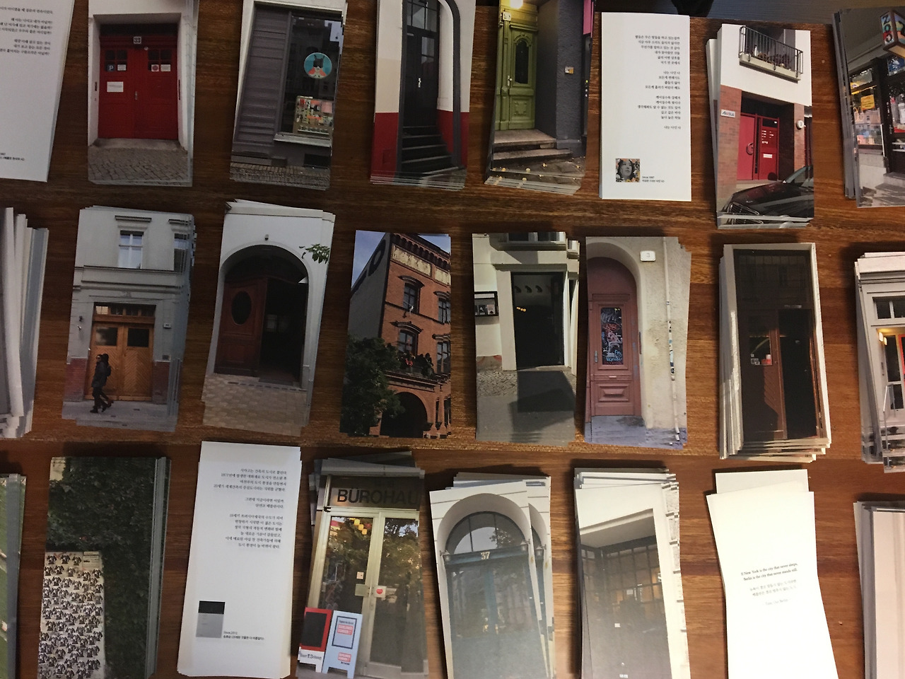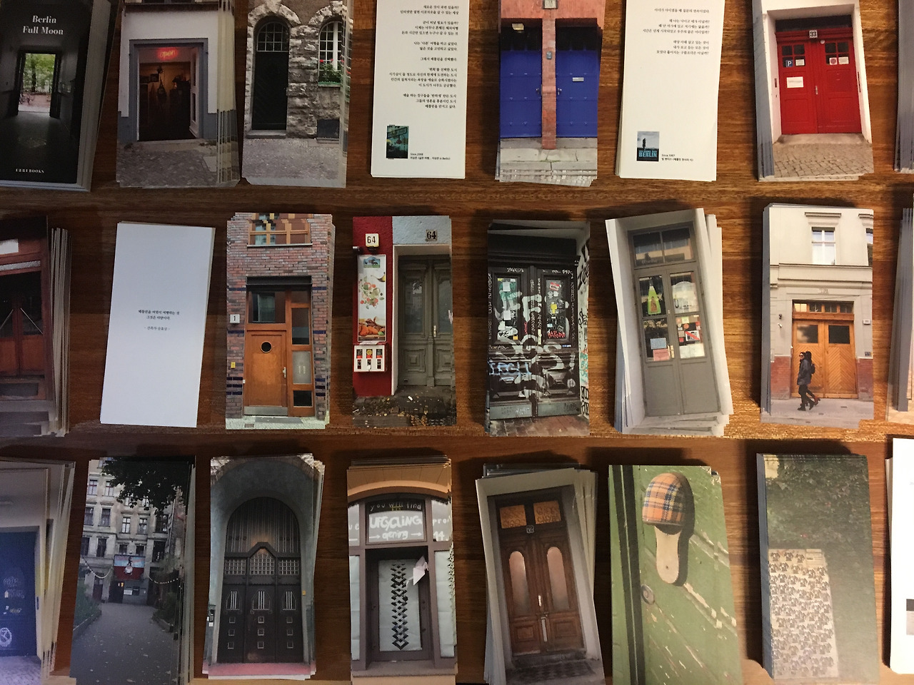 전혀 계획에 없던 책이었다. 지난주 침대에서 멍때리고 앉아있다 벽에 붙여놓은 호안미로 작품 엽서가 눈에 들어왔다. 엽서로 길들여진 사이즈와는 다른, 꽤 크고 긴 형태의 엽서! 이 형태가 무척 독특하고 또 호안미로 작품과 아주 잘 어울려 기분좋게 샀던 기억이 생생하다. 몇년간 방 한켠에 두고 지낸 엽서였는데, 그날따라 갑자기 그 엽서가 프레임으로 보이더니 베를린에서 찍어온 문들이 그 속에 쏙쏙 들어가는 그림이 그려졌다. 오! 길다란 문 엽서를 만들어볼까? 바로 컴퓨터를 열어 베를린 사진첩을 뒤졌다. 호안미로 엽서와 같은 비율로 베를린 문 사진을 넣어보는데.. 마음에 쏘옥 드는 것이었다!