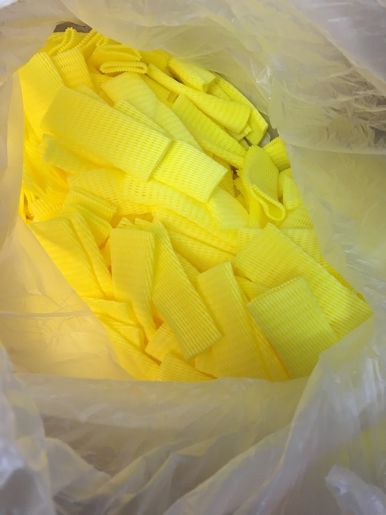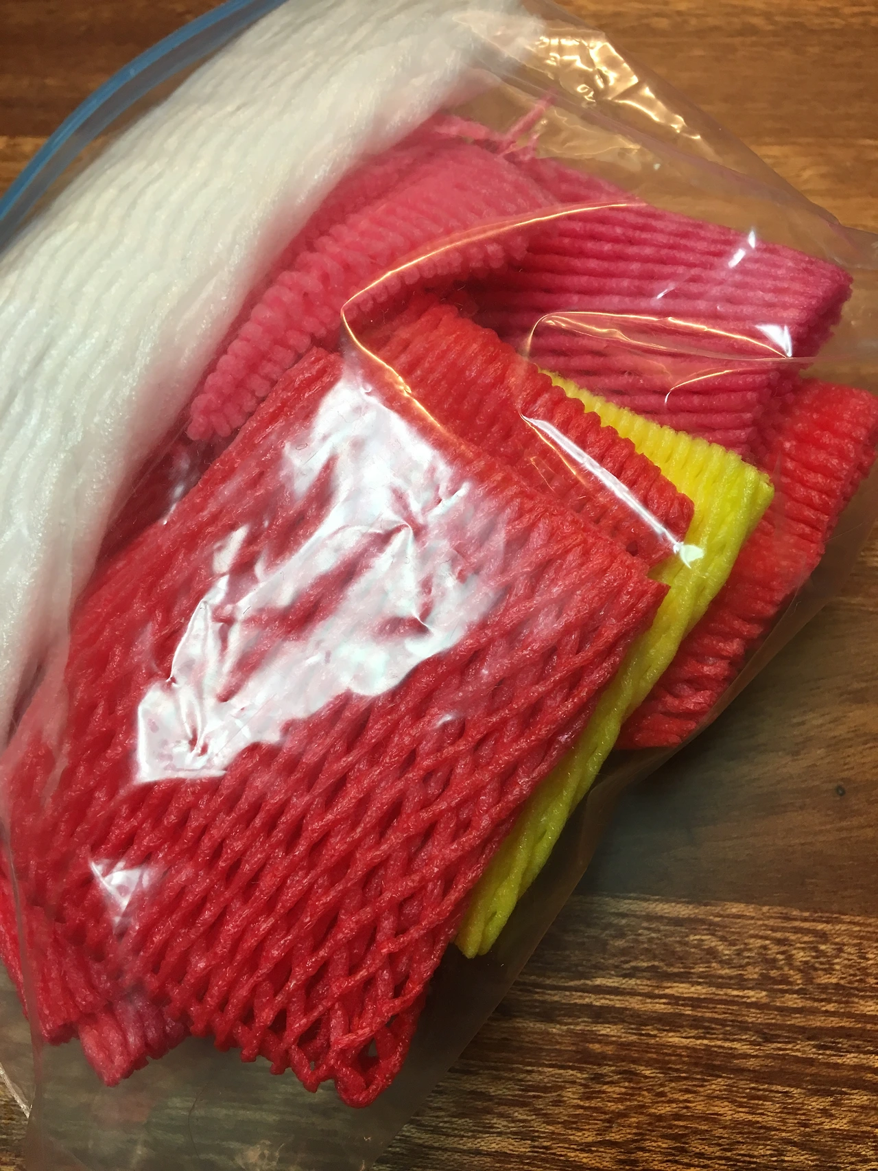 평생동안 갖가지 포장재를 모아온 나는 그중에서도 딸기플라스틱통과 과일망을 좋아했다. 엽서 종이가 상하지 않아야 해서 완충이 가능하면 좋겠는데다 OPP봉투를 쓰는 것은 왠만하면 싫어서 다른거다른거다른거~ 를 찾다가! 앗! 풀문에 과일망을 씌어볼까?