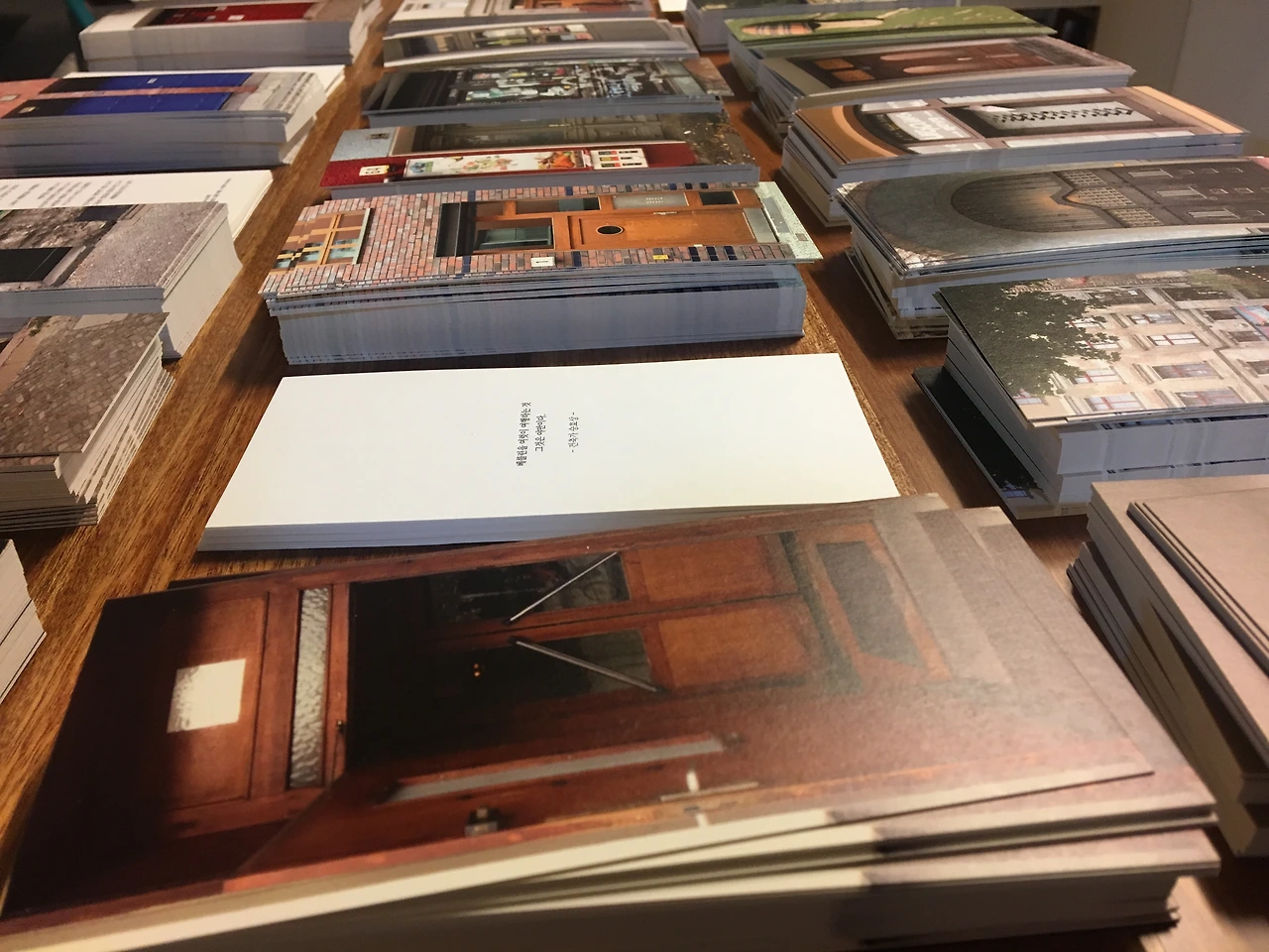 40종류의 엽서를 원하는 순서대로 펼쳐놓은 뒤 기스나 지문이 남지 않도록 아주 조심스레 한장씩 한장씩 모았다. 처음엔 이게 뭐 그렇게 힘들겠어? 했는데..... 한시간이 다 되도록 겨우 10세트 남짓을 모으고 나니.... 이 일이 보통일이 아님을 깨닫게 되었지만.... 이미 늦었다. 펼쳐놓은 이상 세트를 다 모아놓아야했다... 2000장이 넘는 종이가 내 손을 거쳤고 꼬박 4시간동안 단순노동을 반복했다.