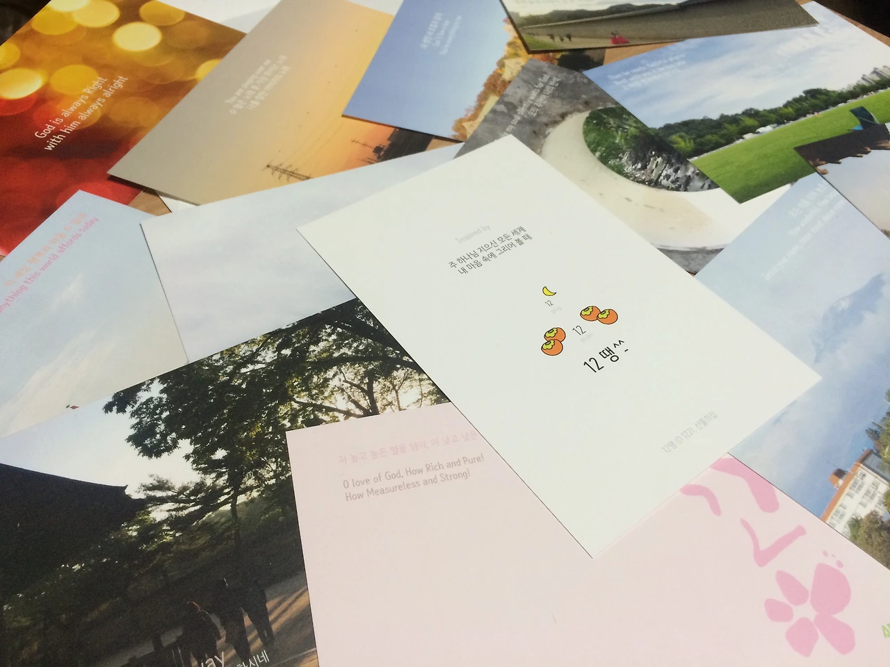 소울메이트들에게 가장 좋아하는 찬양을 물어봤습니다. 소중한 사람들이 좋아하는 찬양의 영문가사와 한글가사에서 많은 사람들에게 전하고 싶고, 배경의 자연과도 잘 어울리는 메시지들을 뽑아냈습니다. 12땡쓰를 작업하는 내내 열두곡의 찬양을 계속해서 들었고, 좋아하는 사람들이 좋아하는 곡이 저에게도 소중한 기도가 될 수 있었습니다.