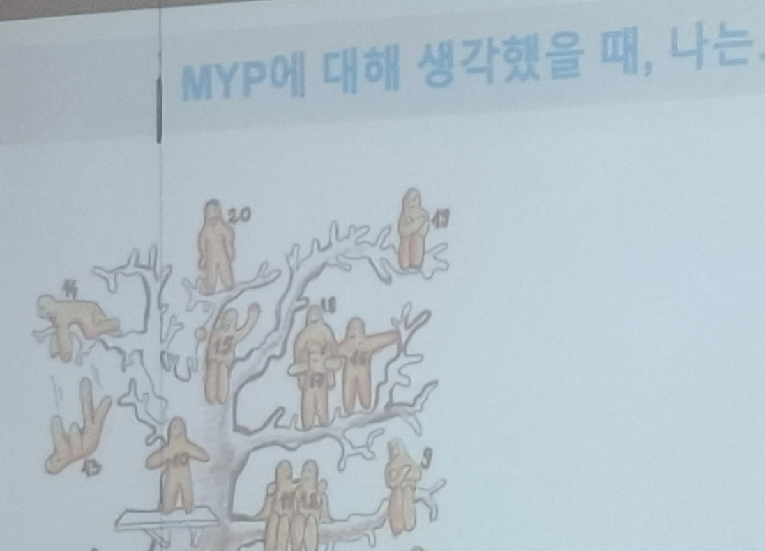 강연 후반부에 강사님이 던진 질문이다. MYP(Middle Years Program-중학교 프로그램)에 대해 생각했을 때 나는 어떤 위치에 있는 사람일까? 그룹 내에서 선생님들과 나눔을 진행했는데 각자의 고충과 질문이 많아 토론을 끊기 힘들 정도였다. 그런 점들을 오히려 칭찬하며 '말하자, 배워서 남 주자의 철학이 IB이며 주려면 배워야 하고 배웠으면 그것을 나누고 쓰고 말해야 한다'는 점을 알려주셨다.