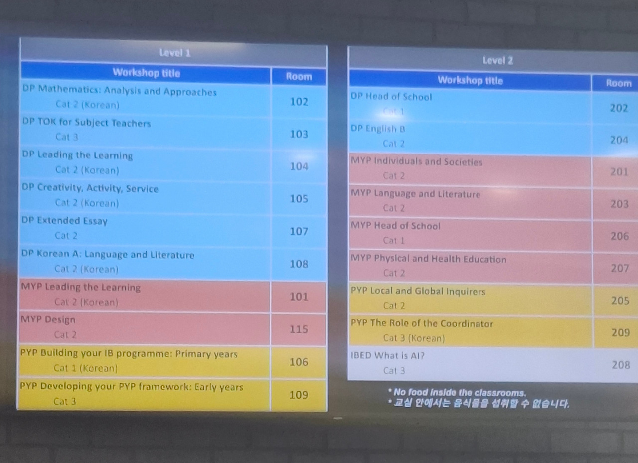 우리 나라에서 IB(국제 바칼로레아)학교 인증을 받으려면 관심학교-후보학교를 거쳐 인증을 받아야 비로소 IB 월드스쿨(인증학교)이 될 수 있다. 관심 학교는 내가 속한 학교 단계로, 말 그대로 담당자가 관심을 가지고 책을 읽고 각종 출장을 다니며 연수를 듣고 수업을 참관하고 워크샵에 참여하며 배우는 단계이다. 관심 학교 단계에서는 업무 담당자가 들어야 하는 필수 연수인 Leading the Learning Category1.과 교장 선생님이 들어야 하는 HOS cat1.(Head of School Category 1) 있다. 여기서 Cat 1.이란 기초적인 단계의 연수로서 IB 프로그램 전반에 대한 이해를 도모하는 프로그램이다. 이 두 가지 연수를 필수로 듣고 학교 구성원들의 동의가 60% 이상이 될때 합의를 통해 후보학교로 진입할 수 있다. 그러나 실제로 Cat 1 연수에 등록하기는 무척 어려워서 연수를 듣는 것 자체가 힘든 상황이었다. 수시로 ibo 홈페이지에 들어가보아도 빈 자리가 쉽사리 나지 않았다. 그래서 어쩔 수 없이 조금 더 심화 단계이지만 빈자리가 있는 Leading the Learning Cat2에 등록하게 되었다.