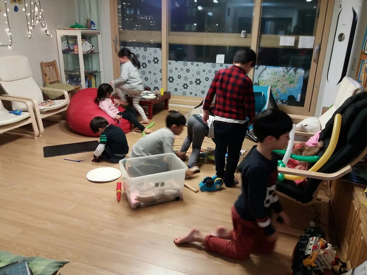 거실에서 수다. 각 방엔 아이들. 거실에서도 놀기.