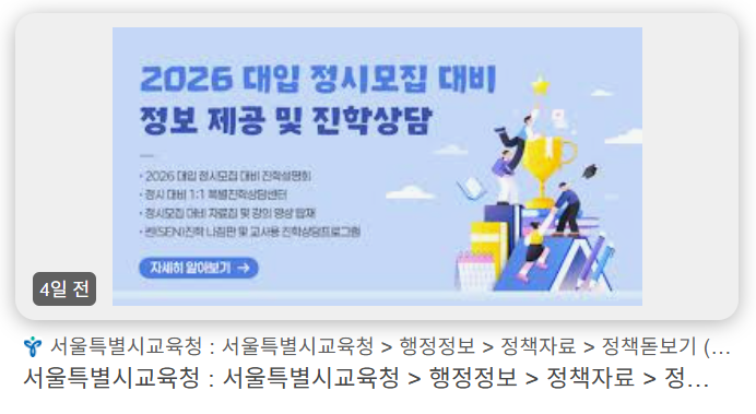 서울특별시교육청 저는 내년 다시 고3엄마로 돌아옵니다. 2년의 입시생 엄마로 지내다 보니, 입시에 대해 공부하게 되고 조금은 마음을 내려놓게도 되네요. 대학입시가 바뀌기 직전 마지막 수능이어서 우리 둘째의 입시는 또 어떨지 모르지만 저도 조금 쉬었다가 다시 힘을 내보렵니다.