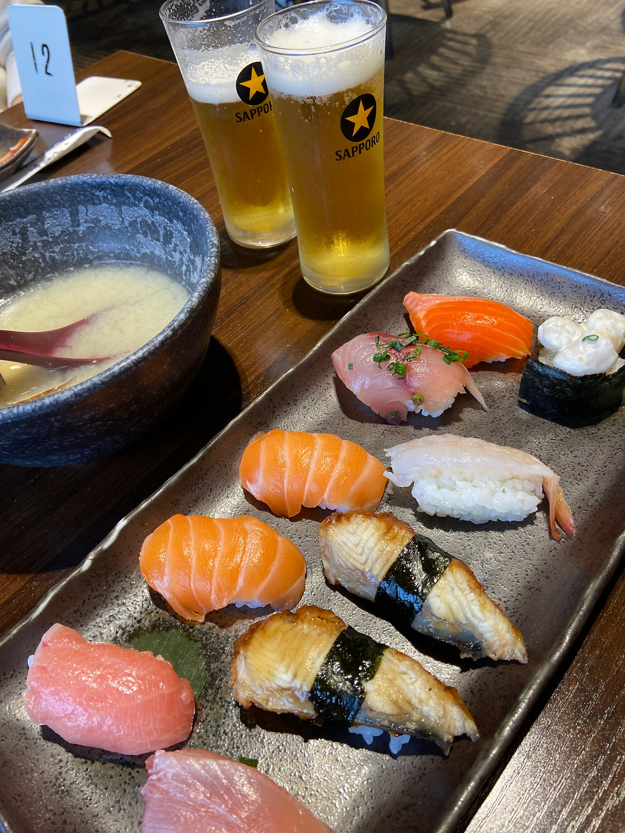 꼬치 모둠 두 판을 시키고 표고버섯 세트를 추가하였고 부모님과 함께 일본 맥주를 먹었어요. 참고로 저는 24년 만에 처음으로 술을 먹어봤습니다.