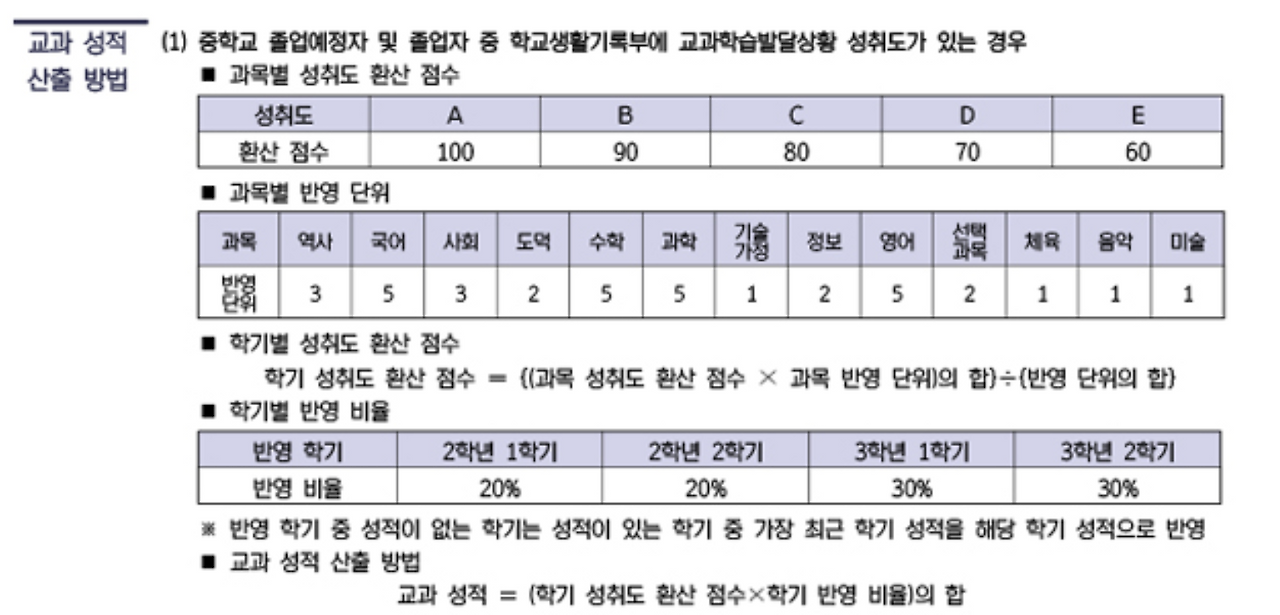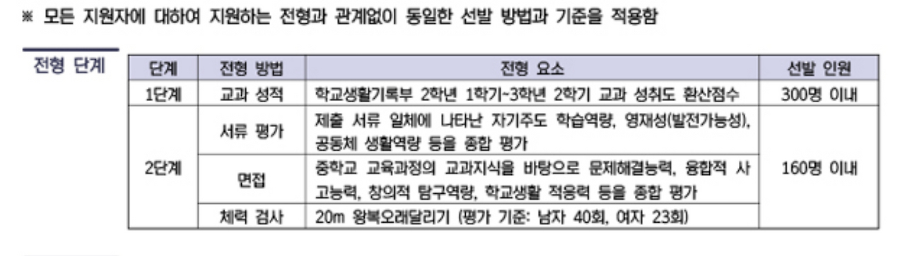 전형은 그냥 모두다 일반전형이라고 보면 된다. 그 말은, 1차로 성적표로 2배수 합격자를 선발하고, 2차는 서류심사와 면접전형 총 100분, 그리고 체력검사를 통과해야한다. 2차 전형 준비에 대해서는 다음편에 자세히 다루도록 하겠다. 어디보자, 성적은 모두다 A를 받아야 한다 혹은 B 가 한두개 있어도 된다 소문은 무성하지만, 결론은 B가 최소한 중3때는 없는 것이 좋다. 아들은 중1때 수학 1학기때 B가 하나 있었지만 1차를 통과했다.