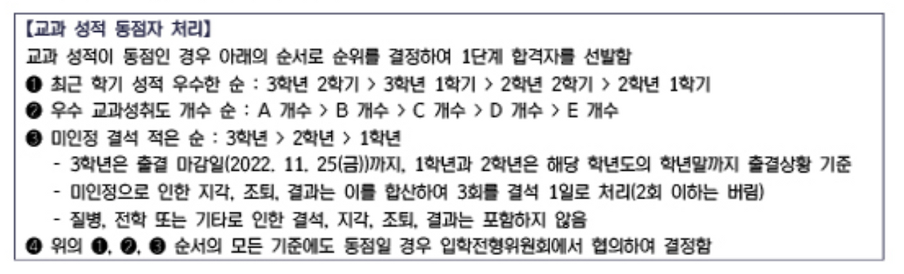 앗, 지금 민사고 홈페이지를 들어가보니, 중1 성적은 반영을 하지 않는 것으로 심사기준이 바뀌었다. 그렇다면 총 4학기 성적에 B가 없어야 하는 편이 안전하다고 본다. 거의 모든 지원자들일 all A 성적표를 들고 지원하기 때문에 1차 합격자를 선별하는 동점자처리 기준까지 살펴야 한다.