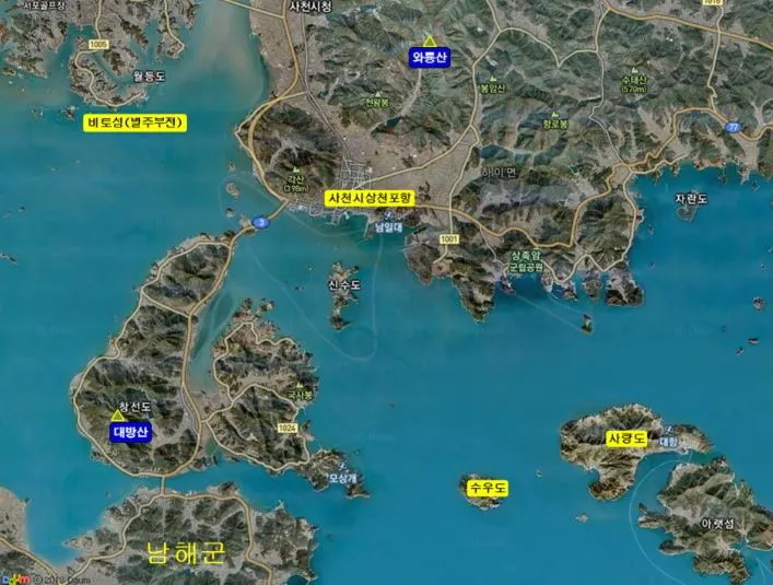 하루는 치마에다 돌을 싸 갖고 징금다리로 놓은 것이 늑도, 초양도, 신도, 농개섬, 마도, 학섬 들이다. 작업하다가 발을 헛디뎌 몸이 기웃둥 하다가 끼고 있던 가락지를 진흙 속에 떨어트려 그것을 찾는다고 주물럭거린 것이 축동 쪽의 나지막한 야산들이 되었다고 한다. 대방산에 올라 진주 쪽을 바라보면 나지막한 야산들이 마고할미가 가락지 찾는다고 주물럭거린 흔적이 확연하다.