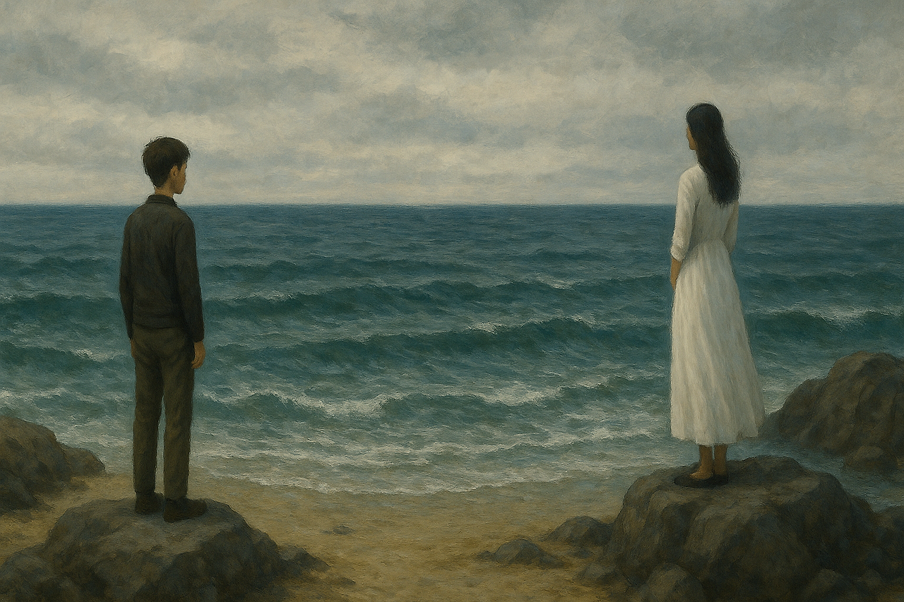 나는 종이에 금이 간 갯바위, 검푸른 바다, 닿지 못한 파도를 그렸다. 그것은 바로 나 자신이었다. 그 순간, 그녀의 손끝이 떨렸고, 시선은 창 너머 먼바다를 향했다. 그녀의 눈에는 나와 닮은 깊고 검은 구멍이 숨어 있었다. 바다 쪽에 던져진 시선을 거두며, 그녀는 내 그림을 다시 내려다보고는, 조용히 옆에 앉아 말했다.