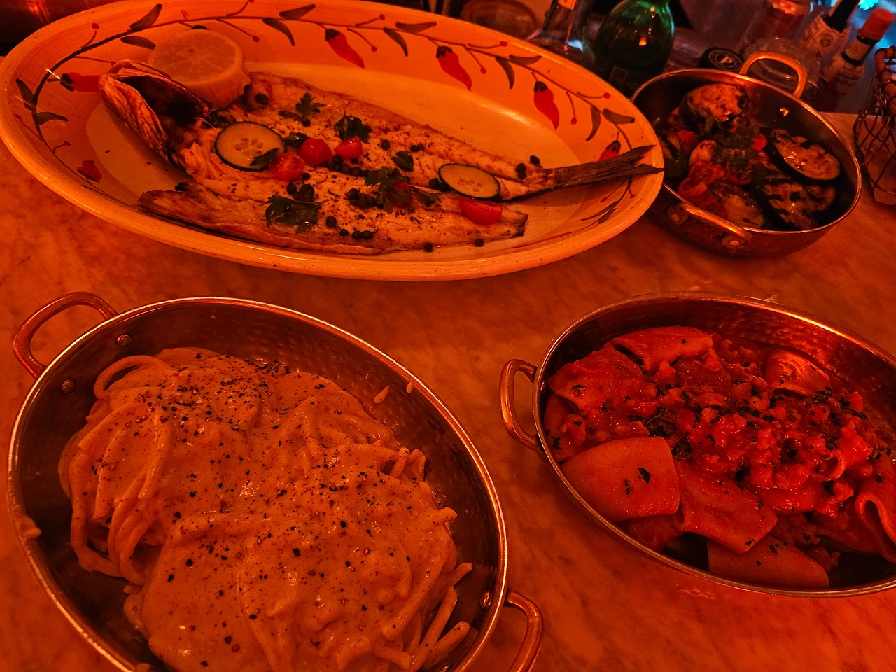 Pasta, 구운 지중해 농어 (Grilled Branzino), 야채 샐러드를 주문하고 이탤리산 White Wine도 한 병 주문한다.