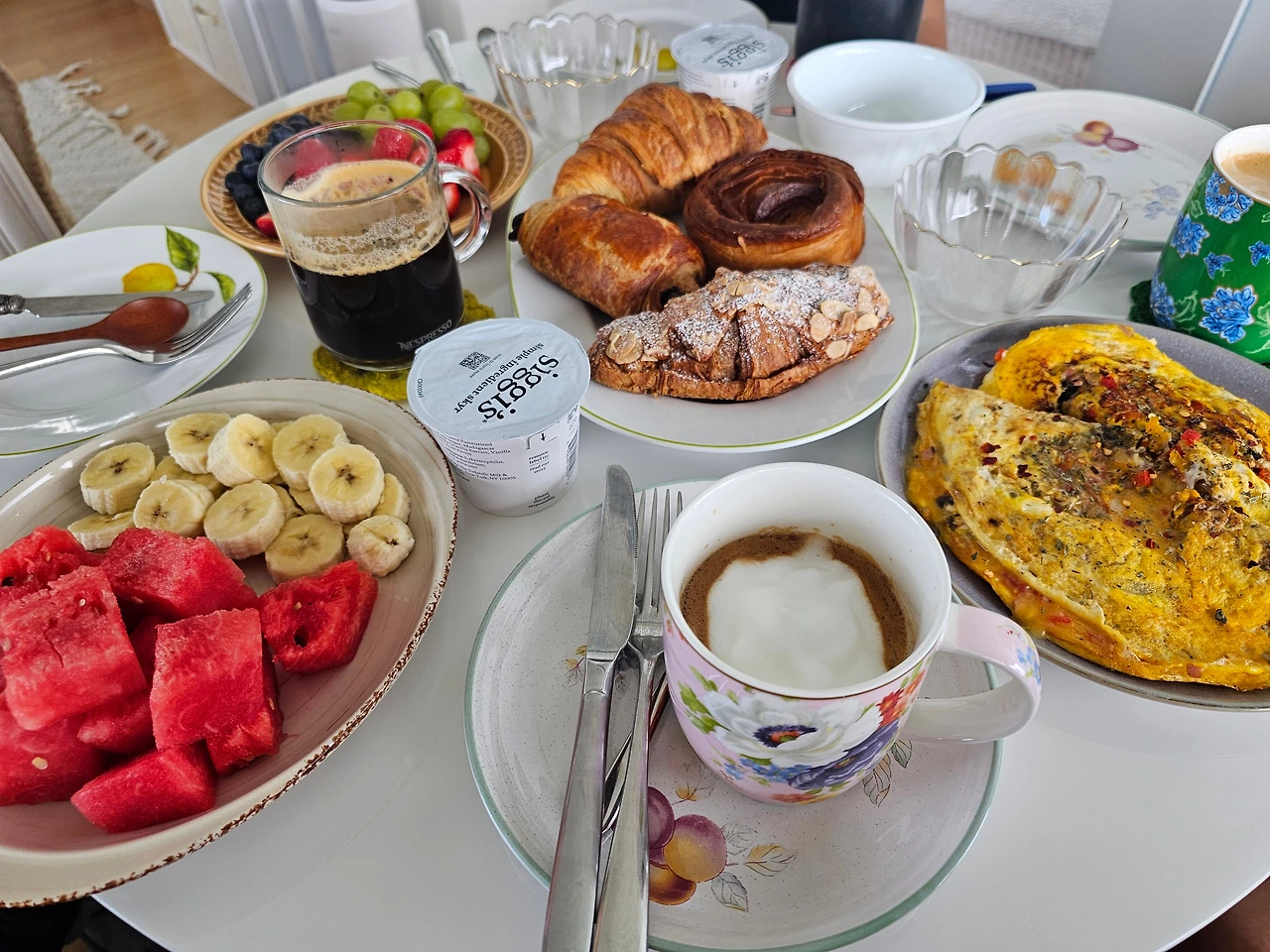 아내와 딸이 정성을 담아 차린 오믈렛, Maman Bakery 빵, 그라놀라, 요거트, 과일과 커피가 아점 메뉴다.