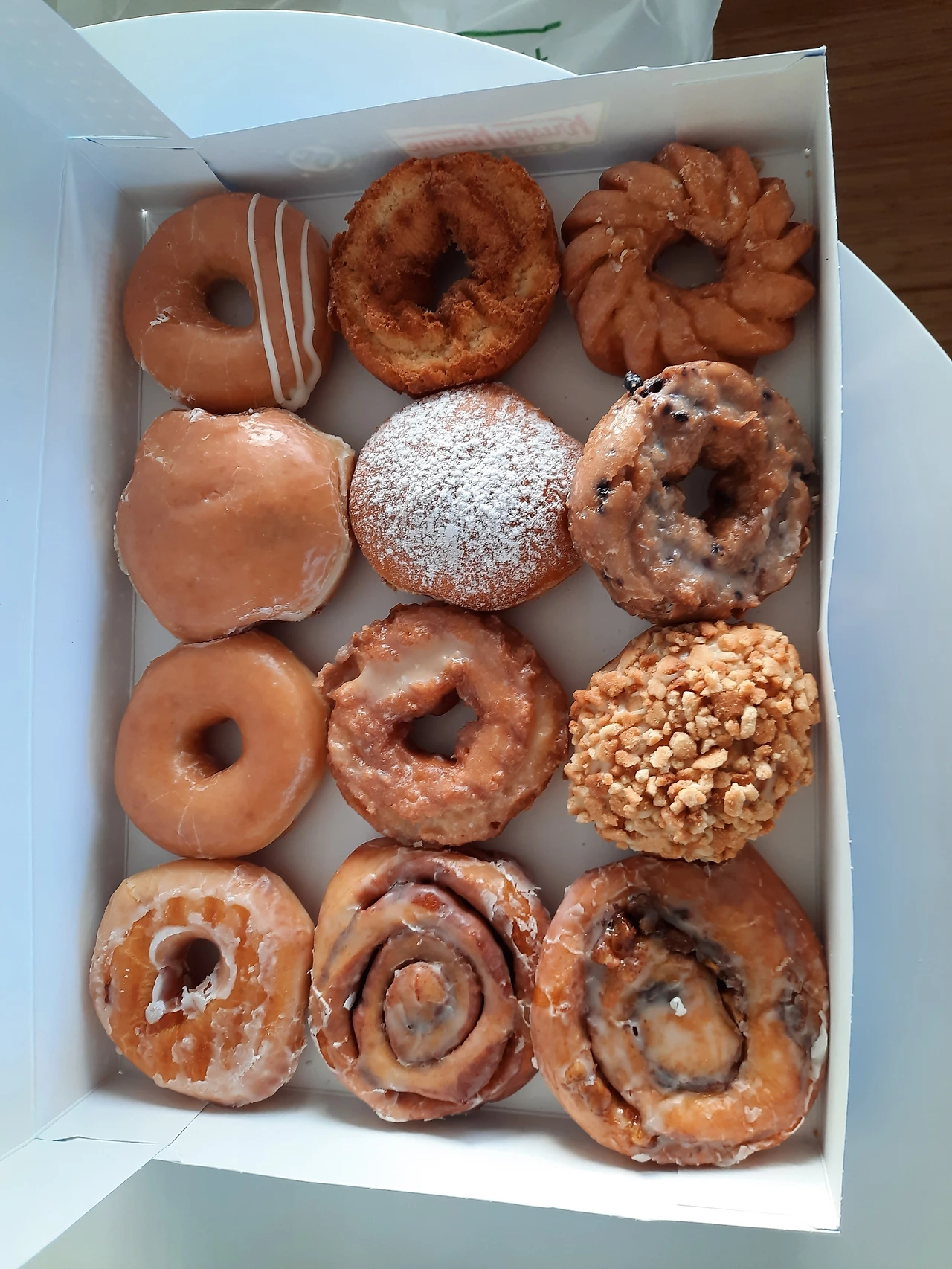가게 안에서는 새벽부터 도넛들을 굽고 있다. 갓 구운 도넛들을 보니 욕심이 발동, 12개 들이 1 Dozen 박스를 들고 아파트로 돌아왔다. 오랜만에 크리스피 크림 도넛을 본 딸은, 예전의 추억을 언급하며 반가움을 표한다.