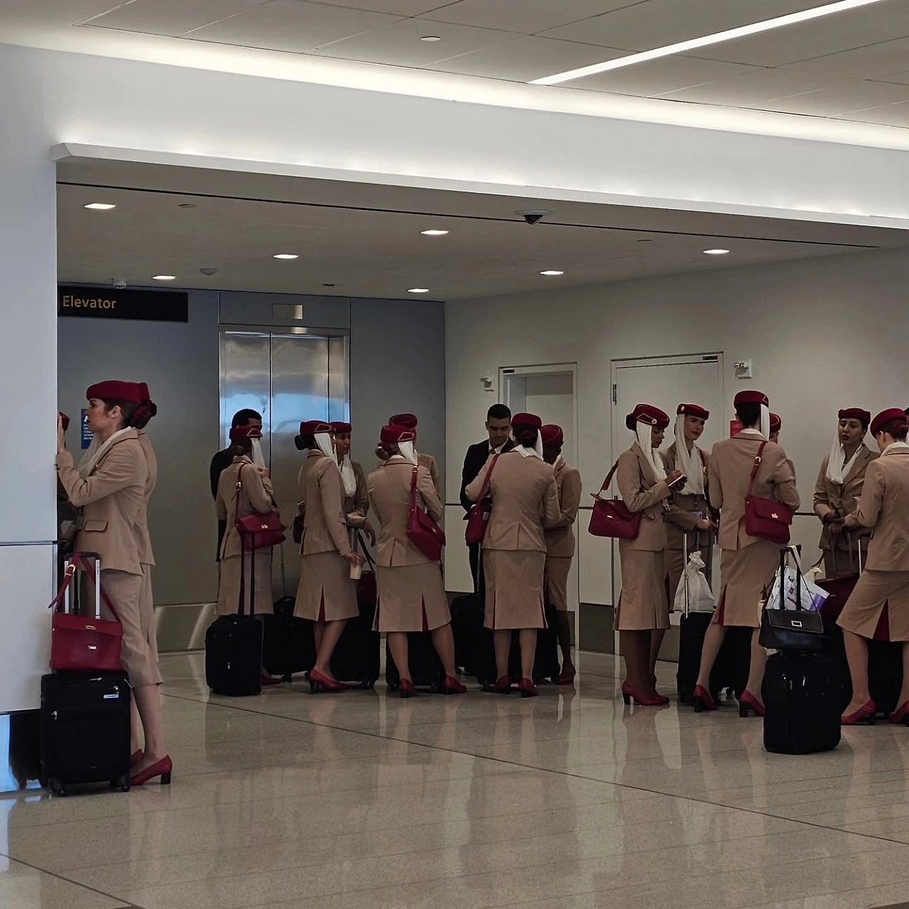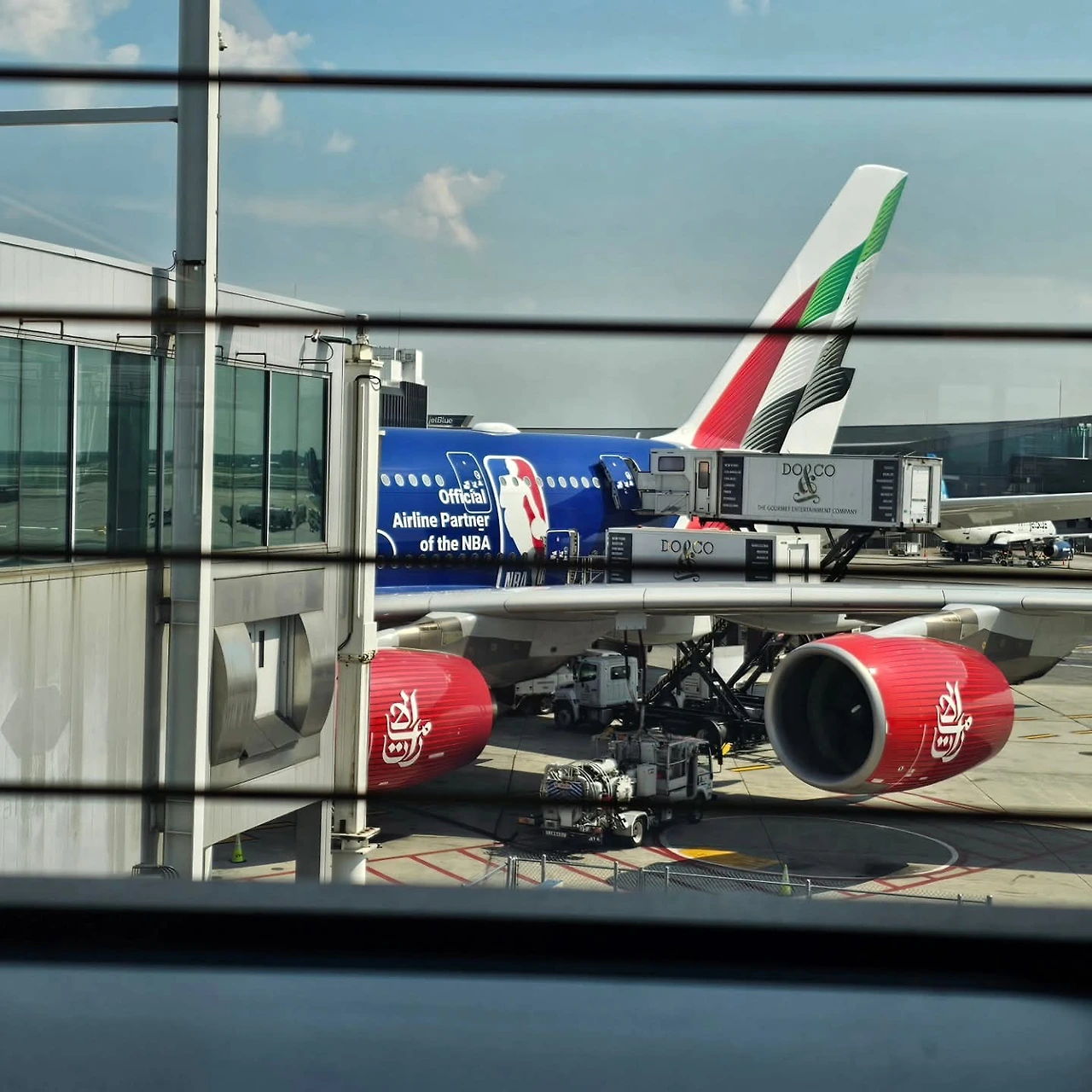 JFK 공항에서 두바이행 비행기 탑승을 기다린다.
