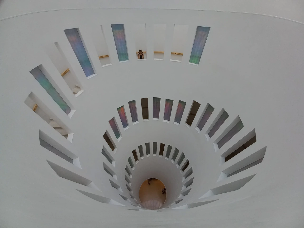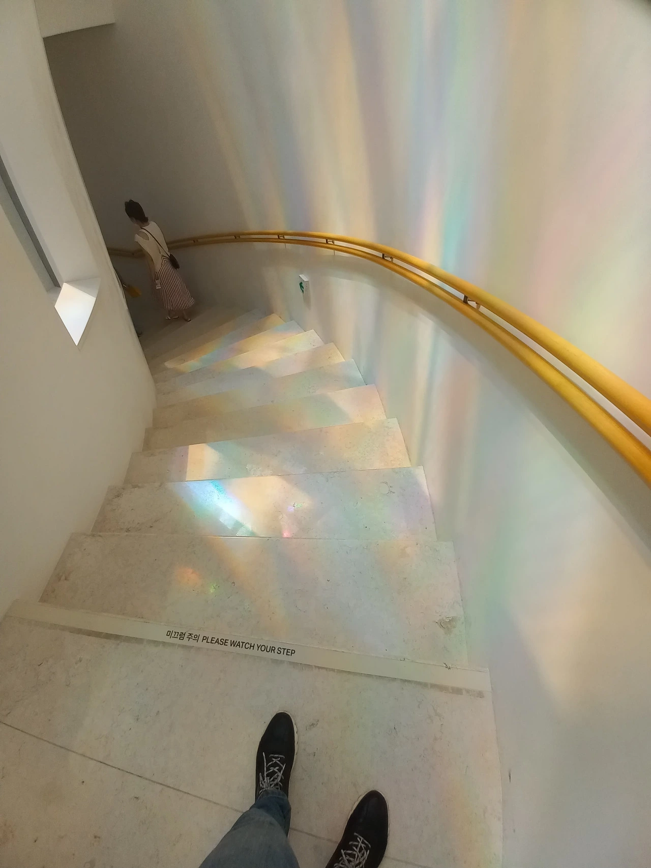다음 전시를 관람하기 위해 화이트 톤의 나선형 계단을 하나씩 발로 밟으며 내려갔다. 계단의 벽 쪽에 붙어있는 오색 창들은 빛을 머금어 아름다운 색채를 연출하였고, 나는 고개를 들어 채광창에서 쏟아지는 빛의 향연을 만끽하였다. 이러한 의식을 통해 몸과 마음을 정화시킨 후 남아있는 테마를 찾아 떠났다.