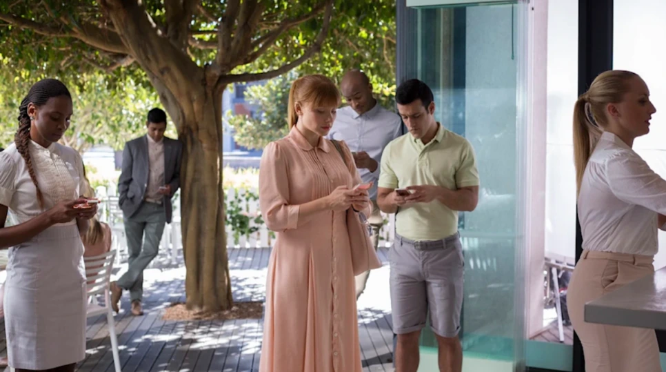 사람의 평판으로 등급이 나누어지는 삶. 소셜미디어 상에서 보이는 평판이 신원보증서가 된 삶. 이 세계는 마치 미리 짜인 인공적인 스노볼 같다. 거울 앞에 서서 인공적인 웃음을 만들어내는 연습을 하고, 먹다 뱉을 정도로 맛없는 쿠키를 "부드러운 음료와 쿠키"로 바꿀 수 있는 곳, 이곳에선 SNS 상의 별점이 곧 '생존'이 되는 삶이다. 생존을 위해선? 레이시는 평점을 4.5 이상으로 만들어야 한다.