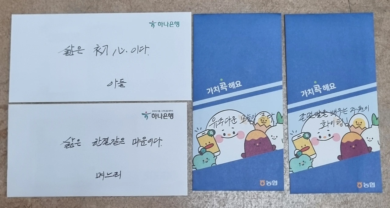 덕담 德談아들에게는 “삶은 초심 初心이다”라고 쓰고,며느리에게는 “삶은 한결같은 마음이다”라고 쓰고,손녀에게는 “유주다운 모습이 좋다”라고 칭찬하고,손자에게는 “존댓말을 배우는 주원이 파이팅!”이라고덕담 德談을 쓰고 세뱃돈을 건넸건만받은 한 장의 세뱃돈에내 차지는 없네.