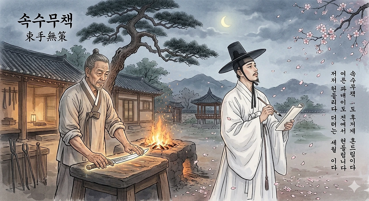 속수무책 束手無策수천 번의 망치질 끝에풀무 화덕의 불꽃을 품은 장도 粧刀를 만드는장인 匠人의 눈망울은지는 꽃잎을 보며시 詩를 짓는 시인 詩人의 눈망울은덧없는 세월 앞에젖어 흔들립니다.