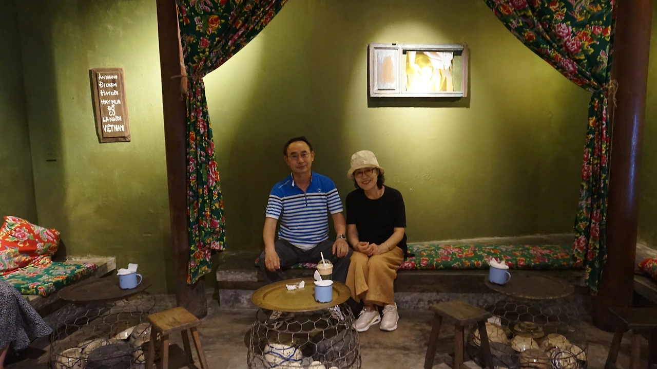 아들내외의 추천으로 들어간 콩카페는 코코넛커피와 스무디가 유명하다 하여 스무디를 주문했는데 다낭과 호이안에서 2번 음미한 그대로 부드러움과 향이 단음식을 좋아하는 나에겐 취향적격이다. 내부는 6.25 전쟁터 같은, 강화도 조양방직 카페 같은 느낌이다. 옛것에 착상된 인테리어라지만 안락함을 좋아하는 나에게는 왜 젊은이들이 이곳을 선호하는지 왜 군복색의 유니폼을 착용하는지 자유롭지 못한 군인시절 때문인지 가난했던 기억의 꼬리가 추억이 되지는 못하나 보다.