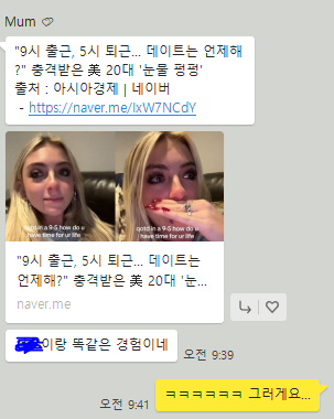 미국 누리꾼은 전부 공감했다는데 한국인들 반응 너무해.... 솔직히 사회 초년생이 개인 SNS에 너무 힘들다고 찡찡댈 수 있는 거 아닌가? 반응이 왜... 싶어서 좀 무섭다는 생각이 들었다. 그리고 뭐 안 하겠다, 이렇게 일 시키는 사람들이 꼰대다, 너무하다 뭐 이런 것도 아니고 헐~ 풀타임 잡이 이런 거였어? 생각과는 너무 다르고 되게 힘들다. ㅠㅠ 이런 건데 거기다가 대고 일하지 말라, 고마운 줄 알라, 복에 겨웠다 등... ㅎ 호주 직딩이면서 한국인들 반응에 왜 이렇게 신경 쓰냐면... 엄마도, 아빠도 저 댓글처럼 말했기 때문이다. 엄마 아빠는 한국인이거든요. 그리고 내가 다니는 회사도 한국인들 뿐이기도 하고....