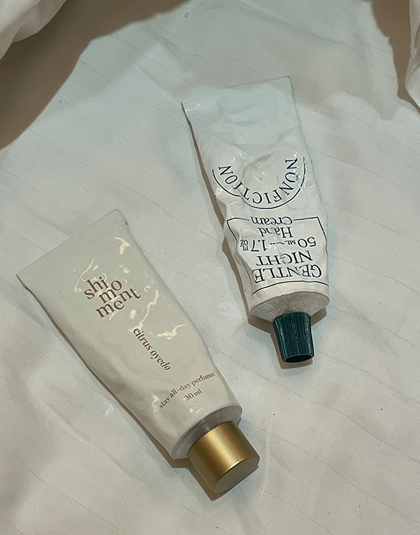 요즘은 고체 향수를 주로 쓰는데, 시모먼트에서 나온 시트러스 오에도라는 제품이에요. 고체 향수여서 그런가 은은하게 지속성이 오래가는 느낌이에요. 시더우드의 베이스로 탑노트는 오렌지, 시트러스 향인데 과일향은 그렇게 강하지 않고 초록 초록한 향이랄까요. 은은하게 계속 제 몸에 풍기는 향이 좋아서 요즘 애용하고 있어요. 핸드크림으로 유명한 논픽션의 젠틀나잇도 주로 이용해요. 사실 저는 꽃 향보단 우디 한 느낌이나 풀냄새를 더 좋아해요. 일할 때 향이 너무 강한 건 손님들에게도 호불호가 있어서, 조금 은은하게 나만 맡을 수 있을 정도의 느낌으로 고체 향수나 핸드크림을 이용해요. 손 쪽에서 올라오는 숲의 향이 기분전환을 시켜주어서 기분전환용으로 비행이 끝난 후나, 서비스가 끝난 후 손을 씻고 한 번씩 이용해요. 지금 이 인터뷰 답변을 하고 있는 곳이 사이판인데, 인터뷰를 작성하며 향을 맡아보니 분위기도 딱 바다와 나무, 그리고 수영장이 내려다보이는 테라스네요.
