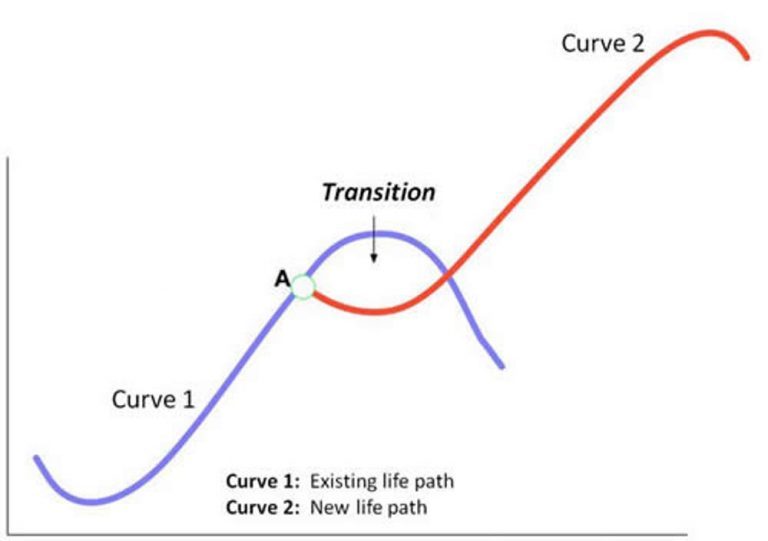 찰스 핸디는 2번째 곡선을 뽑아낼 A 지점을 '편안함'과 '안정성'으로 지적하였다. 그림에서도 보이는 바와 같이 본인의 주가가 정점으로 치닫는 시기이다. 정점에서 끝을 볼 수 있는 능력의 소유자는 많지 않다.