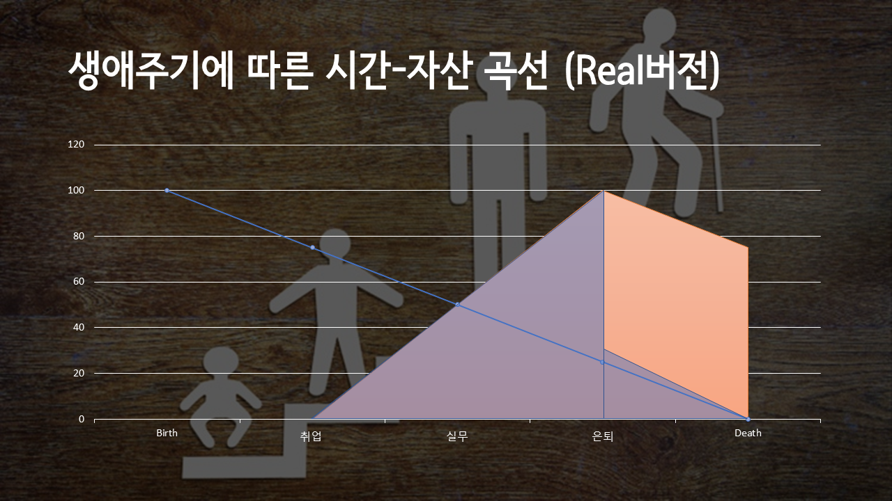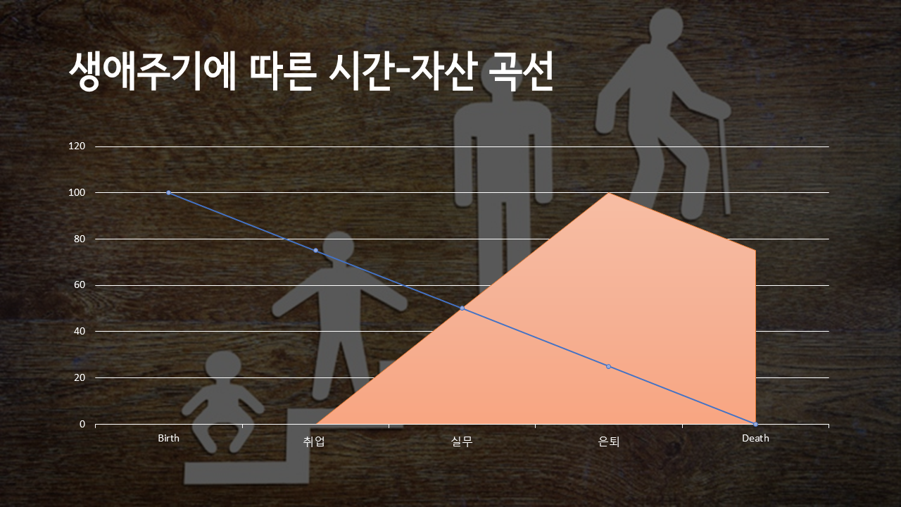 피터 드러커의 예를 들지 않더라도, 시간은 대체 불가능한 유일한 자원이다. 젊은 날엔 일(취업이던, 사업이던)을 위한 준비를 하고, 이후 가치를 제공함으로써 수익을 얻게 될 때, 자산은 증가하게 된다. 아울러 은퇴와 함께, 자산의 곡선은 점점 하향곡선을 그리고, 죽음과 함께 한 사람의 인생이 마감되게 된다.