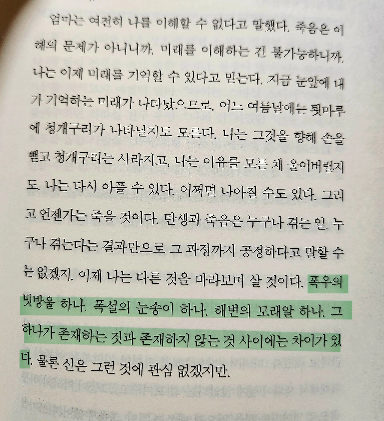 이제 나는 다른 것을 바라보며 살 것이다. 폭우의 빗방울 하나, 폭설의 눈송이 하나, 해변의 모래알 하나. 그 하나가 존재하는 것과 존재하지 않는 것 사이에는 차이가 있다. 물론 신은 그런 것에 관심 없겠지만.