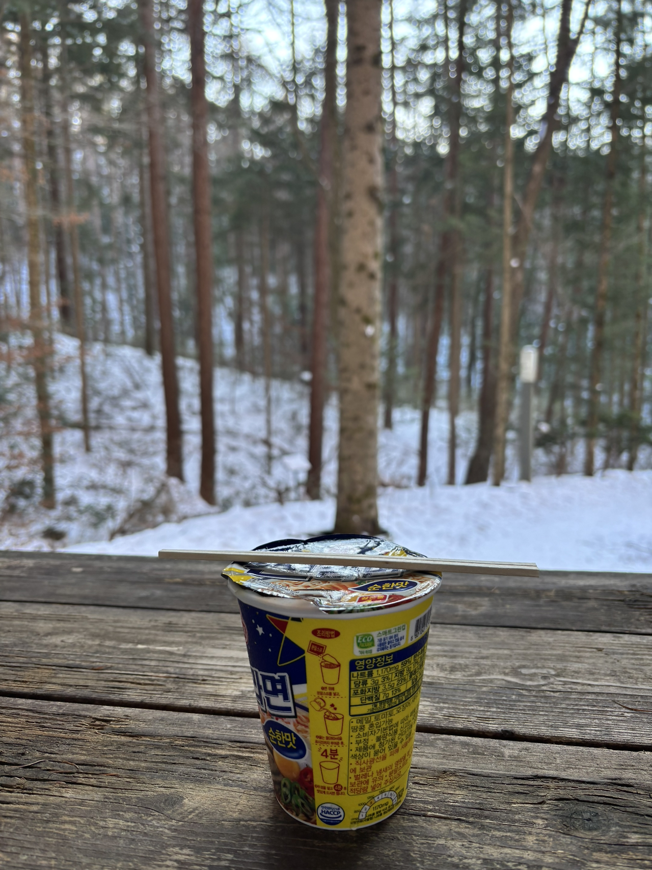 숙소에 도착해 짐을 풀고 개인시간을 가졌다. 언니들은 전나무 숲에서 사진을 찍는다 했다. 나는 컵라면을 하나 들고 숲 속으로 향했다. 컵라면을 기다리면서 조용히 눈을 감았다. 작은 소음조차 들리지 않았다. 고요하다는 표현으로 부족할 만큼 고요했다. 이상하게 고요한 이 순간이 너무 따뜻했다. 세상은 원래 이처럼 고요했고 그 순간 소음을 내는 건 오직 나 하나였다. 어긋난 돼지발톱 같은 나를 세상은 언제나 조용히 감싸줄 수 있다, 기다려줄 수 있다 말을 건네주는 것 같았다.