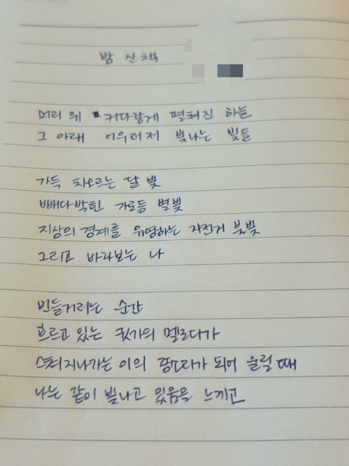 산책하는 걸 좋아한다. ‘산’과 ‘책’이란 발음을 내뱉을 때 앞니 사이로 시원한 바람이 불어 나오는 것 같다. 공기를 가르며 걸어 나가는 상쾌함에 일주일에 4번 정도는 산책을 한다. 지난 추석 명절에 대전에서는 밤 산책을 나섰다.
