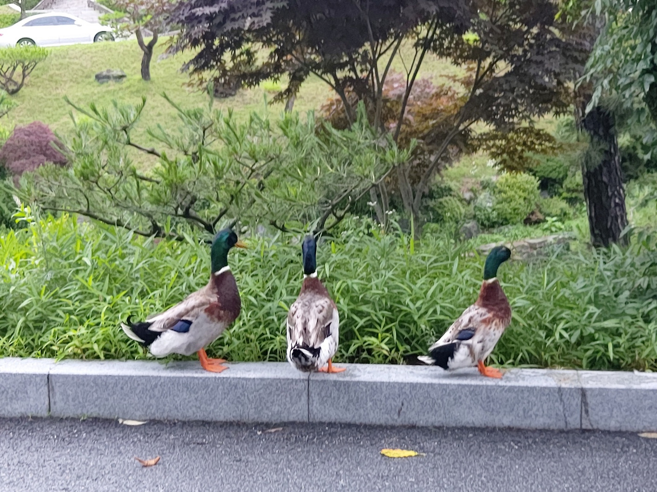 <**연수원에 사는 청둥오리 삼 남매_사람을 자주 봐서인지 카메라를 들이대면 이렇게 포즈를 취해준다>