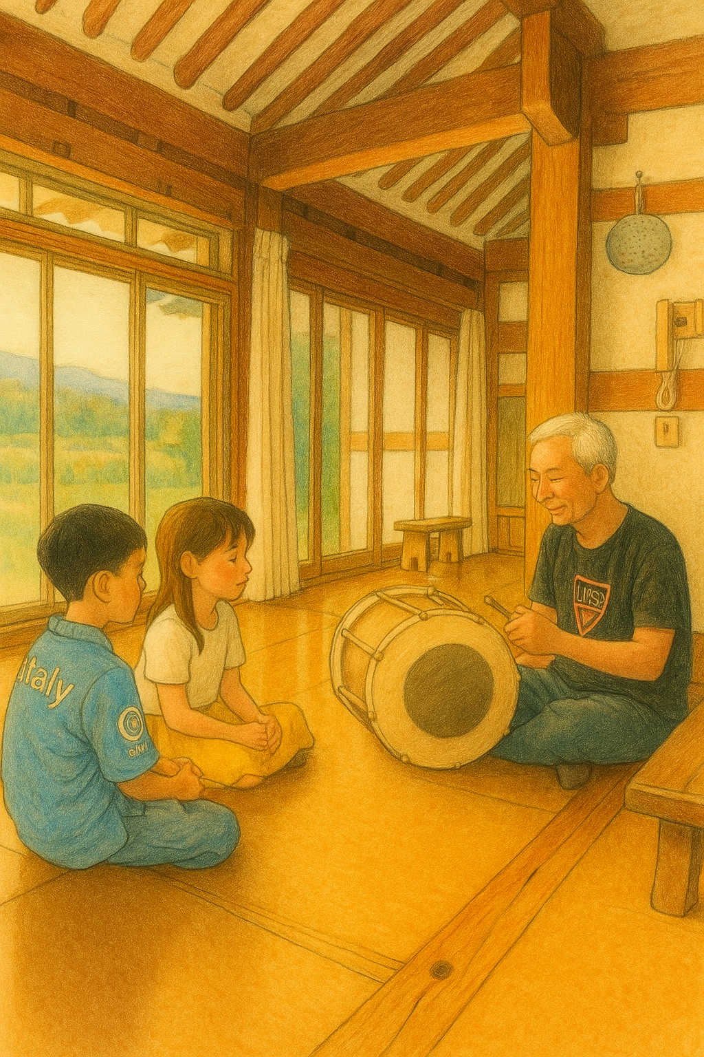 한국의 전통 북소리가 고즈넉한 한옥에 울려 퍼지는 순간, 아이들의 눈이 동그랗게 커졌다. 둥둥 울려 퍼지는 장고 소리가 한옥의 따뜻한 마루를 가득 메우며, 나무 기둥과 서까래 사이사이를 돌아 더욱 깊고 풍성한 울림이 되어 되돌아왔다. 일본에서는 결코 들어볼 수 없었던 깊은 울림과 리듬이었다.
